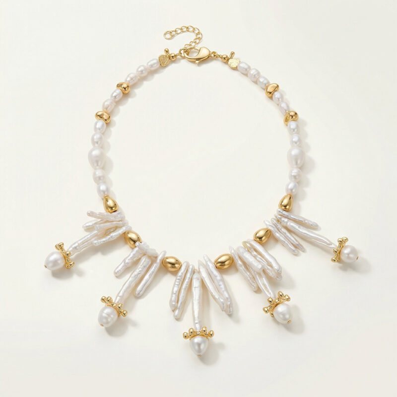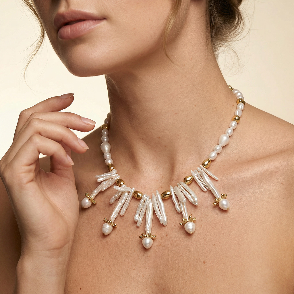 Çeşitli barok inciler ve altın kaplama parçalarla yapılmıştır.