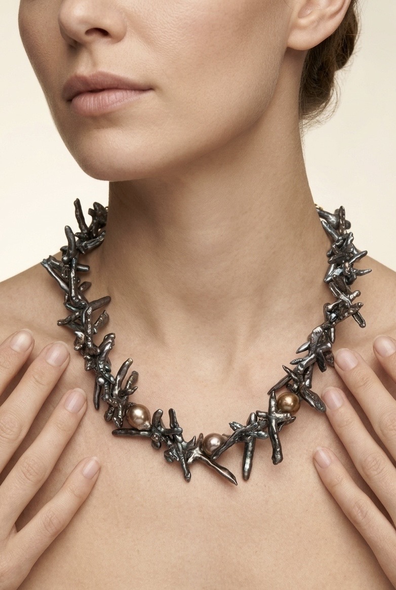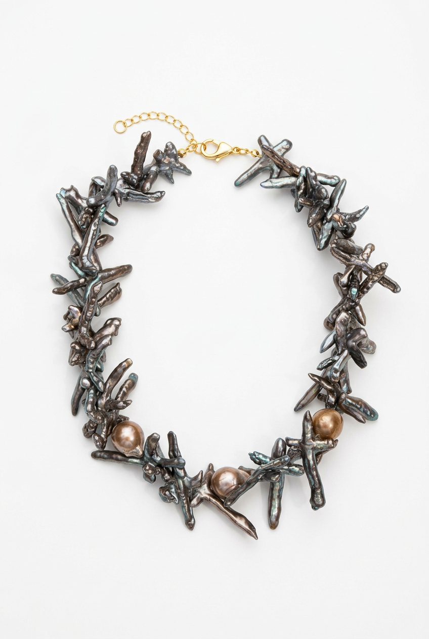 | Siyah barok inci ve altın kaplama parçalarla yapılmıştır. |