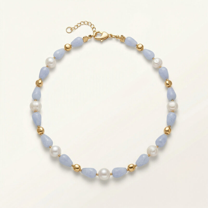 Kalsedon, inci ve altın kaplama parçalarla yapılmıştır.