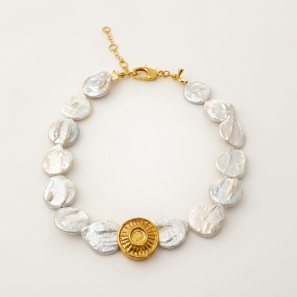 Choker kolye, barok inci ve altın kaplama parçalarla yapılmıştır.