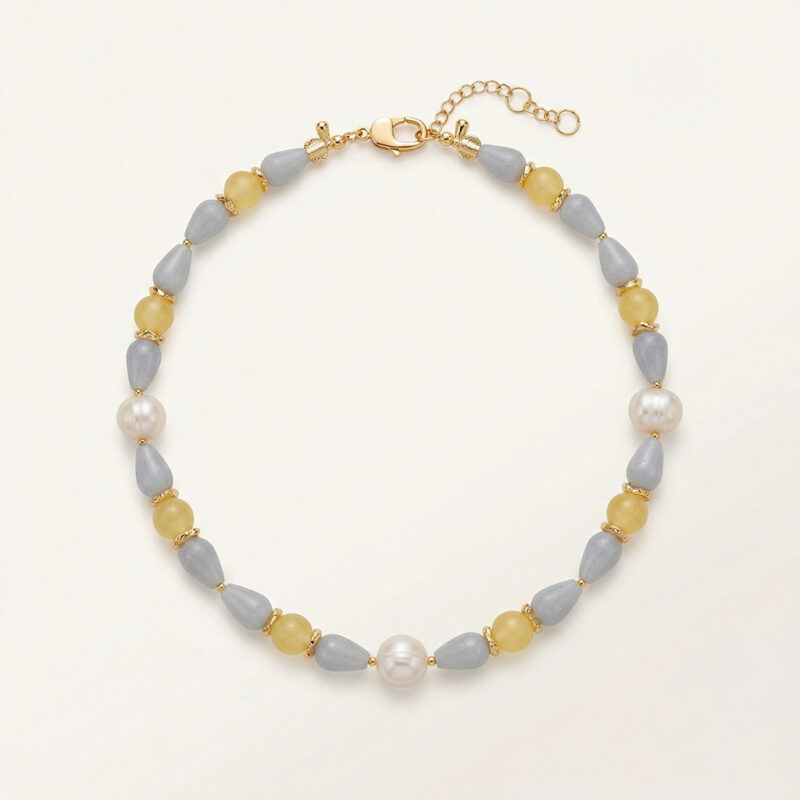 Kalsedon, limon kuvars taşı, inciler ve altın kaplama parçalarla yapılmış.